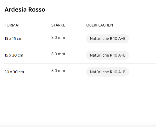 StartseiteFliesenArdesiaArdesia Rosso Quantity of products in cart must be 10 or moreArdesia RossoCHF33,00 / m2wählen Wählen Sie eine OptionFORMAT : 15 x 15 cm, STÄRKE : 8.0 mm, OBERFLÄCHEN : Natürliche R 10 A+BFORMAT : 15 x 30 cm, STÄRKE : 8.0 mm, OBERFLÄCHEN : Natürliche R 10 A+BFORMAT : 30 x 30 cm, STÄRKE : 8.0 mm, OBERFLÄCHEN : Natürliche R 10 A+BLeerenWählen Sie die Menge als Quadratmeter aus: Ardesia Rosso Menge Buy now Artikelnummer: n. a. Kategorien: Fliesen, Ardesia Product ID: 20140 Beschreibung Zusätzliche Information Bewertungen (0) Beschreibung Zusätzliche InformationwählenFORMAT : 15 x 15 cm, STÄRKE : 8.0 mm, OBERFLÄCHEN : Natürliche R 10 A+B, FORMAT : 15 x 30 cm, STÄRKE : 8.0 mm, OBERFLÄCHEN : Natürliche R 10 A+B, FORMAT : 30 x 30 cm, STÄRKE : 8.0 mm, OBERFLÄCHEN : Natürliche R 10 A+B BewertungenEs gibt noch keine Bewertungen. Schreiben Sie die erste Bewertung für «Ardesia Rosso» Antworten abbrechenIhre E-Mail-Adresse wird nicht veröffentlicht. Erforderliche Felder sind mit * markiertName *E-Mail * Meinen Namen, meine E-Mail-Adresse und meine Website in diesem Browser für die nächste Kommentierung speichern.Ihre Bewertung *Bewertung…AusgezeichnetGutDurchschnittlichNicht ganz schlechtSehr schlecht Ihre Rezension * I agree that my submitted data is being collected and stored.Please enter an answer in digits:seven + fifteen = Ähnliche Produkte MILA beige matt. CHF29,40 – CHF33,20 / m2 Buy now Dieses Produkt weist mehrere Varianten auf. Die Optionen können auf der Produktseite gewählt werden UNLIMITED beige. CHF56,25 – CHF105,85 / m2 Buy now Dieses Produkt weist mehrere Varianten auf. Die Optionen können auf der Produktseite gewählt werden Newcon dunkelgrau CHF10,05 – CHF14,50 / m2 Buy now Dieses Produkt weist mehrere Varianten auf. Die Optionen können auf der Produktseite gewählt werden TAILORED ivory matt. CHF33,00 – CHF37,00 / m2 Buy now Dieses Produkt weist mehrere Varianten auf. Die Optionen können auf der Produktseite gewählt werden
