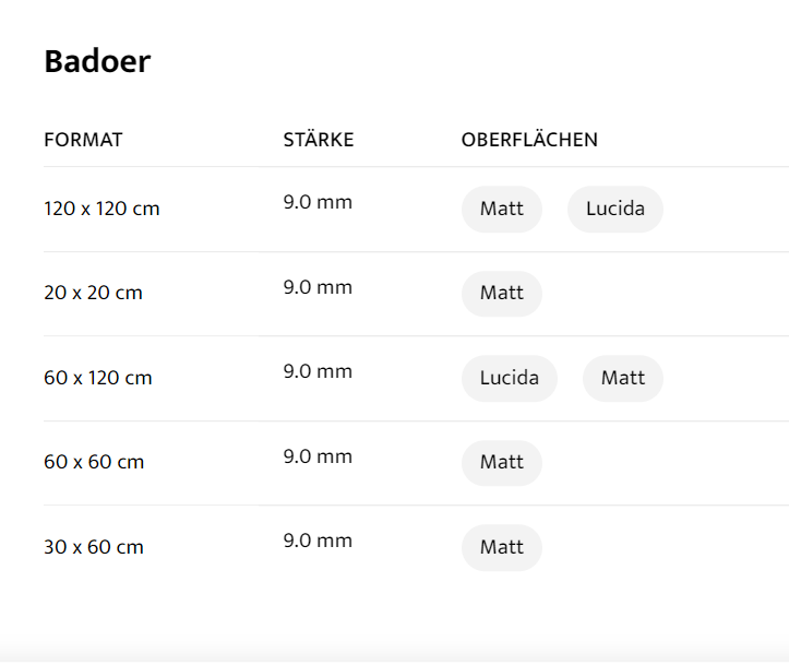 | wählen | FORMAT : 120 x 120 cm, STÄRKE : 9.0 mm, OBERFLÄCHEN : Matt Lucida, FORMAT : 20 x 20 cm, STÄRKE : 9.0 mm, OBERFLÄCHEN : Matt, FORMAT : 60 x 120 cm, STÄRKE : 9.0 mm, OBERFLÄCHEN : Lucida Matt, FORMAT : 60 x 60 cm, STÄRKE : 9.0 mm, OBERFLÄCHEN : Matt, FORMAT : 30 x 60 cm, STÄRKE : 9.0 mm, OBERFLÄCHEN : Matt |