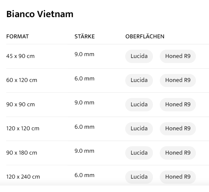 | wählen | FORMAT : 45 x 90 cm, STÄRKE : 9.0 mm, OBERFLÄCHEN : Lucida Honed R9, FORMAT : 60 x 120 cm, STÄRKE : 6.0 mm, OBERFLÄCHEN : Lucida Honed R9, FORMAT : 90 x 90 cm, STÄRKE : 9.0 mm, OBERFLÄCHEN : Lucida Honed R9, FORMAT : 120 x 120 cm, STÄRKE : 6.0 mm, OBERFLÄCHEN : Lucida Honed R9, FORMAT : 90 x 180 cm, STÄRKE : 9.0 mm, OBERFLÄCHEN : Lucida Honed R9, FORMAT : 120 x 240 cm, STÄRKE : 6.0 mm, OBERFLÄCHEN : Lucida Honed R9 |