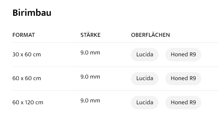 | wählen | FORMAT : 30 x 60 cm, STÄRKE : 9.0 mm, OBERFLÄCHEN : Lucida Honed R9, FORMAT : 60 x 60 cm, STÄRKE : 9.0 mm, OBERFLÄCHEN : Lucida Honed R9, FORMAT : 60 x 120 cm, STÄRKE : 9.0 mm, OBERFLÄCHEN : Lucida Honed R9 |