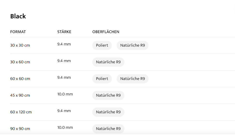 FORMAT : 30 x 30 cm, STÄRKE : 9.4 mm, OBERFLÄCHEN : Poliert Natürliche R9, FORMAT : 30 x 60 cm, STÄRKE : 9.4 mm, OBERFLÄCHEN : Natürliche R9, FORMAT : 60 x 60 cm, STÄRKE : 9.4 mm, OBERFLÄCHEN : Poliert Natürliche R9, FORMAT : 45 x 90 cm, STÄRKE : 10.0 mm, OBERFLÄCHEN : Natürliche R9, FORMAT : 60 x 120 cm, STÄRKE : 9.4 mm, OBERFLÄCHEN : Natürliche R9, FORMAT : 90 x 90 cm, STÄRKE : 10.0 mm, OBERFLÄCHEN : Natürliche R9