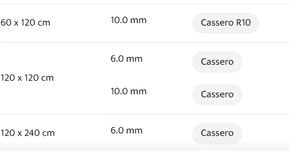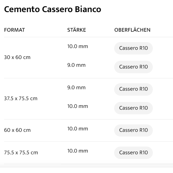 FORMAT : 30 x 60 cm, STÄRKE : 10.0 mm, OBERFLÄCHEN : Cassero R10, FORMAT : 30 x 60 cm, STÄRKE : 9.0 mm, OBERFLÄCHEN : Cassero R10, FORMAT : 37.5 x 75.5 cm, STÄRKE : 9 mm, OBERFLÄCHEN : Cassero R10, FORMAT : 37.5 x 75.5 cm, STÄRKE :10.0 mm, OBERFLÄCHEN : Cassero R10, FORMAT : 60 x 60 cm, STÄRKE : 10.0 mm, OBERFLÄCHEN : Cassero R10, FORMAT : 75.5 x 75.5 cm, STÄRKE : 10.0 mm, OBERFLÄCHEN : Cassero R10, FORMAT : 60 x 120 cm, STÄRKE : 10.0 mm, OBERFLÄCHEN : Cassero R10, FORMAT : 120 x 120 cm, STÄRKE : 6.0 mm, OBERFLÄCHEN : Cassero, FORMAT : 120 x 120 cm, STÄRKE : 10.0 mm, OBERFLÄCHEN : Cassero, FORMAT : 120 x 240 cm, STÄRKE : 6.0 mm, OBERFLÄCHEN : Cassero