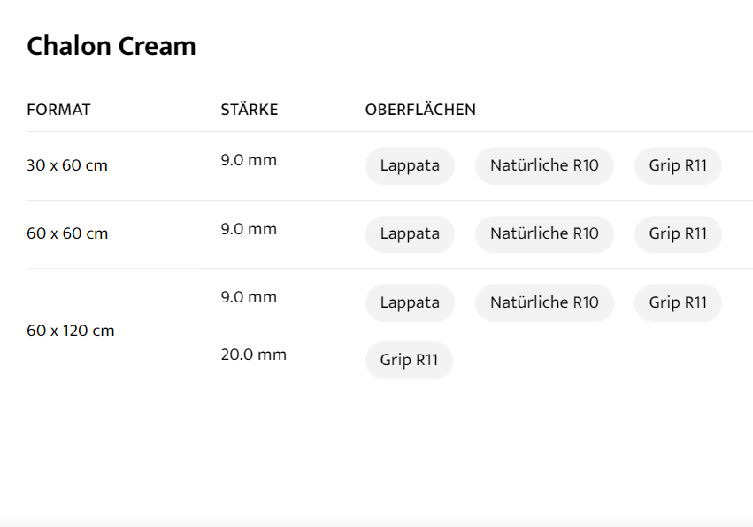 FORMAT : 30 x 60 cm, STÄRKE : 9.0 mm, OBERFLÄCHEN : Lappata Natürliche R10 Grip R11, FORMAT : 60 x 60 cm, STÄRKE : 9.0 mm, OBERFLÄCHEN : Lappata Natürliche R10 Grip R11, FORMAT : 60 x 120 cm, STÄRKE : 9.0 mm, OBERFLÄCHEN : Lappata Natürliche R10 Grip R11, FORMAT : 60 x 120 cm, STÄRKE : 20.0 mm, OBERFLÄCHEN : Grip R11