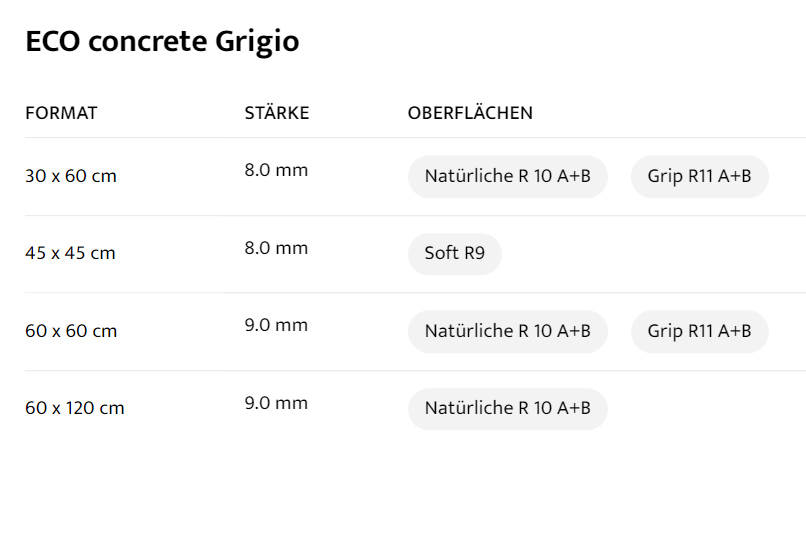 | wählen | FORMAT : 30 x 60 cm, STÄRKE : 8.0 mm, OBERFLÄCHEN : Natürliche R 10 A+B Grip R11 A+B, FORMAT : 45 x 45 cm, STÄRKE : 8.0 mm, OBERFLÄCHEN : Soft R9, FORMAT : 60 x 60 cm, STÄRKE : 9.0 mm, OBERFLÄCHEN : Natürliche R 10 A+B Grip R11 A+B, FORMAT : 60 x 120 cm, STÄRKE : 9.0 mm, OBERFLÄCHEN : Natürliche R 10 A+B |