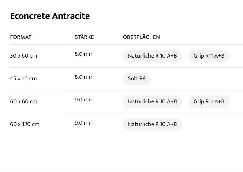 FORMAT : 30 x 60 cm, STÄRKE : 8.0 mm, OBERFLÄCHEN : Natürliche R 10 A+B Grip R11 A+B, FORMAT : 45 x 45 cm, STÄRKE : 8.0 mm, OBERFLÄCHEN : Soft R9, FORMAT : 60 x 60 cm, STÄRKE : 9.0 mm, OBERFLÄCHEN : Natürliche R 10 A+B Grip R11 A+B, FORMAT : 60 x 120 cm, STÄRKE : 9.0 mm, OBERFLÄCHEN : Natürliche R 10 A+B