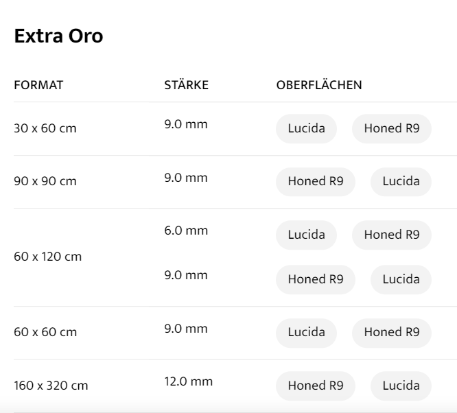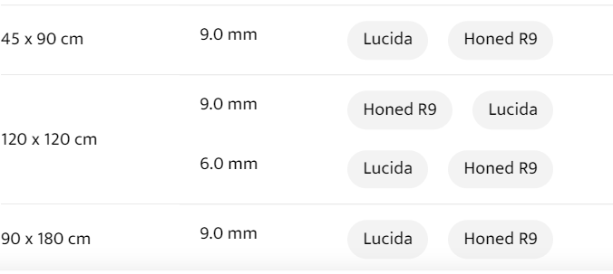 | wählen | FORMAT : 30 x 60 cm, STÄRKE : 9.0 mm, OBERFLÄCHEN : Lucida Honed R9, FORMAT : 90 x 90 cm, STÄRKE : 9.0 mm, OBERFLÄCHEN : Honed R9 Lucida, FORMAT :60 x 120 cm, STÄRKE : 6.0 mm, OBERFLÄCHEN : Lucida Honed R9, FORMAT : 60 x 120 cm, STÄRKE : 9.0 mm, OBERFLÄCHEN : Honed R9 Lucida, FORMAT : 60 x 60 cm, STÄRKE : 9.0 mm, OBERFLÄCHEN : Lucida Honed R9, FORMAT : 160 x 320 cm, STÄRKE :12.0 mm, OBERFLÄCHEN : Honed R9 Lucida, FORMAT :45 x 90 cm, STÄRKE : 9.0 mm, OBERFLÄCHEN : Lucida Honed R9, FORMAT : 120 x 120 cm, STÄRKE : 6.0 mm, OBERFLÄCHEN : Lucida Honed R9, FORMAT : 120 x 120 cm, STÄRKE : 9.0 mm, OBERFLÄCHEN : Honed R9 Lucida, FORMAT : 90 x 180 cm, STÄRKE : 9.0 mm, OBERFLÄCHEN : Lucida Honed R9 |