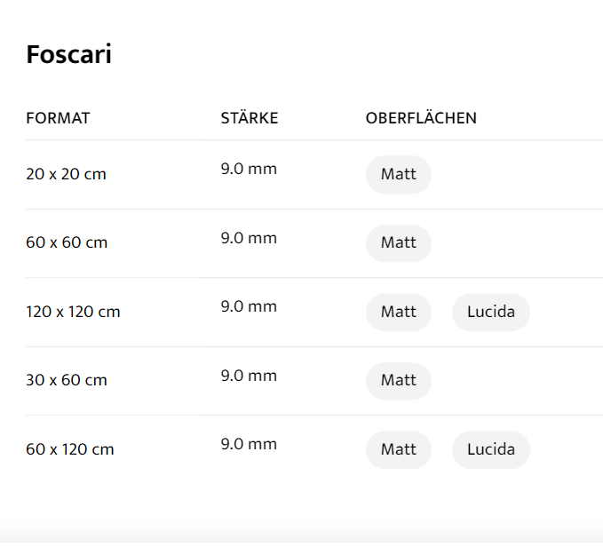 | wählen | FORMAT : 120 x 120 cm, STÄRKE : 9.0 mm, OBERFLÄCHEN : Matt Lucida, FORMAT : 20 x 20 cm, STÄRKE : 9.0 mm, OBERFLÄCHEN : Matt, FORMAT : 60 x 120 cm, STÄRKE : 9.0 mm, OBERFLÄCHEN : Lucida Matt, FORMAT : 60 x 60 cm, STÄRKE : 9.0 mm, OBERFLÄCHEN : Matt, FORMAT : 30 x 60 cm, STÄRKE : 9.0 mm, OBERFLÄCHEN : Matt |