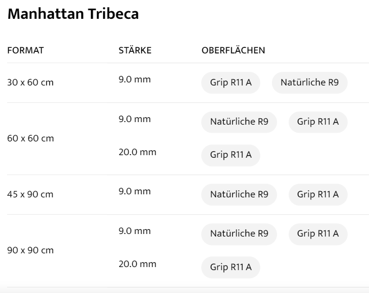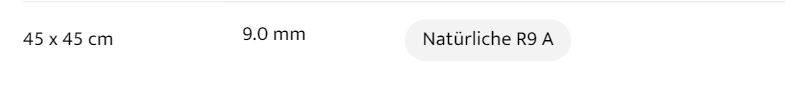 FORMAT : 30 x 60 cm, STÄRKE :9.0 mm, OBERFLÄCHEN : Grip R11 A Natürliche R9, FORMAT : 60 x 60 cm, STÄRKE :9.0 mm, OBERFLÄCHEN : Natürliche R9 Grip R11 A, FORMAT : 60 x 60 cm, STÄRKE 20.0 mm, OBERFLÄCHEN : Grip R11 A, FORMAT : 45 x 90 cm, STÄRKE :9.0 mm, OBERFLÄCHEN : Natürliche R9 Grip R11 A, FORMAT : 90 x 90 cm, STÄRKE :9.0 mm, OBERFLÄCHEN : Natürliche R9 Grip R11 A, FORMAT : 90 x 90 cm, STÄRKE :20.0 mm, OBERFLÄCHEN : Grip R11 A, FORMAT : 45 x 45 cm, STÄRKE :9.0 mm, OBERFLÄCHEN : Natürliche R9 A