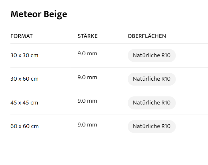| wählen | FORMAT : 30 x 30 cm, STÄRKE :9.0 mm, OBERFLÄCHEN : Natürliche R10, FORMAT : 30 x 60 cm, STÄRKE :9.0 mm, OBERFLÄCHEN : Natürliche R10, FORMAT : 45 x 45 cm, STÄRKE :9.0 mm, OBERFLÄCHEN : Natürliche R10, FORMAT : 60 x 60 cm, STÄRKE :9.0 mm, OBERFLÄCHEN : Natürliche R10 |