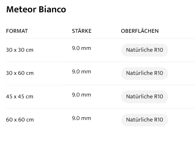 FORMAT : 30 x 30 cm, STÄRKE :9.0 mm, OBERFLÄCHEN : Natürliche R10, FORMAT : 30 x 60 cm, STÄRKE :9.0 mm, OBERFLÄCHEN : Natürliche R10, FORMAT : 45 x 45 cm, STÄRKE :9.0 mm, OBERFLÄCHEN : Natürliche R10, FORMAT : 60 x 60 cm, STÄRKE :9.0 mm, OBERFLÄCHEN : Natürliche R10