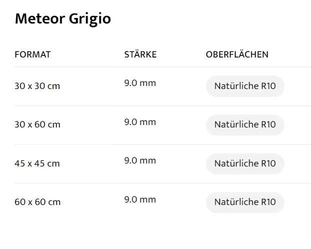| wählen | FORMAT : 30 x 30 cm, STÄRKE :9.0 mm, OBERFLÄCHEN : Natürliche R10, FORMAT : 30 x 60 cm, STÄRKE :9.0 mm, OBERFLÄCHEN : Natürliche R10, FORMAT : 45 x 45 cm, STÄRKE :9.0 mm, OBERFLÄCHEN : Natürliche R10, FORMAT : 60 x 60 cm, STÄRKE :9.0 mm, OBERFLÄCHEN : Natürliche R10 |