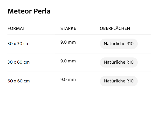 FORMAT : 30 x 30 cm, STÄRKE :9.0 mm, OBERFLÄCHEN : Natürliche R10, FORMAT : 30 x 60 cm, STÄRKE :9.0 mm, OBERFLÄCHEN : Natürliche R10, FORMAT : 45 x 45 cm, STÄRKE :9.0 mm, OBERFLÄCHEN : Natürliche R10, FORMAT : 60 x 60 cm, STÄRKE :9.0 mm, OBERFLÄCHEN : Natürliche R10