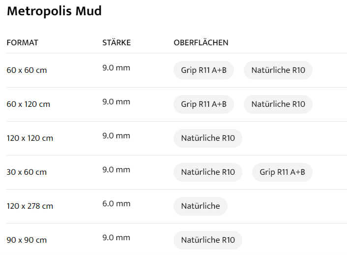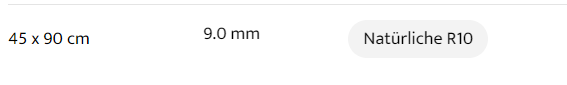 | wählen | 60 x 60 cm , 9.0 mm , Grip R11 A+B , Natürliche R10, 60 x 120 cm , 9.0 mm , Grip R11 A+B, Natürliche R10, 120 x 120 cm , 9.0 mm , Natürliche R10, 30 x 60 cm , 9.0 mm , Natürliche R10 , Grip R11 A+B, 120 x 278 cm , 6.0 mm , Natürliche, 90 x 90 cm , 9.0 mm , Natürliche R10, 45 x 90 cm , 9.0 mm , Natürliche R10 |