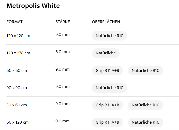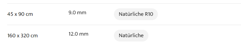 | wählen | 120 x 120 cm , 9.0 mm , Natürliche R10, 120 x 278 cm , 6.0 mm , Natürliche, 60 x 60 cm , 9.0 mm , Grip R11 A+B , Natürliche R10, 90 x 90 cm , 9.0 mm , Natürliche R10, 30 x 60 cm , 9.0 mm , Grip R11 A+B , Natürliche R10, 60 x 120 cm , 9.0 mm , Grip R11 A+B , Natürliche R10, 45 x 90 cm , 9.0 mm , Natürliche R10, 160 x 320 cm , 12.0 mm , Natürliche |