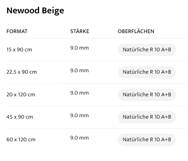FORMAT : 15 x 90 cm, STÄRKE : 9.0 mm, OBERFLÄCHEN : Natürliche R 10 A+B, FORMAT : 22.5 x 90 cm, STÄRKE : 9.0 mm, OBERFLÄCHEN : Natürliche R 10 A+B, FORMAT : 20 x 120 cm, STÄRKE : 9.0 mm, OBERFLÄCHEN : Natürliche R 10 A+B, FORMAT : 45 x 90 cm, STÄRKE : 9.0 mm, OBERFLÄCHEN : Natürliche R 10 A+B, FORMAT : 60 x 120 cm, STÄRKE : 9.0 mm, OBERFLÄCHEN : Natürliche R 10 A+B