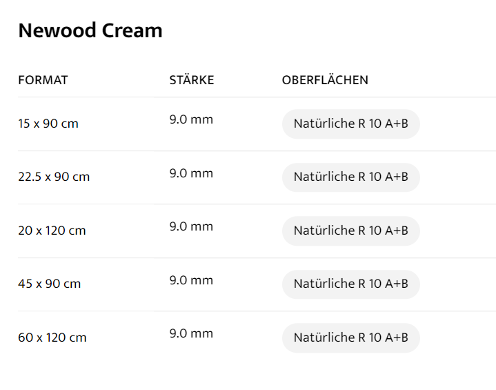 | wählen | FORMAT : 15 x 90 cm, STÄRKE : 9.0 mm, OBERFLÄCHEN : Natürliche R 10 A+B, FORMAT : 22.5 x 90 cm, STÄRKE : 9.0 mm, OBERFLÄCHEN : Natürliche R 10 A+B, FORMAT : 20 x 120 cm, STÄRKE : 9.0 mm, OBERFLÄCHEN : Natürliche R 10 A+B, FORMAT : 45 x 90 cm, STÄRKE : 9.0 mm, OBERFLÄCHEN : Natürliche R 10 A+B, FORMAT : 60 x 120 cm, STÄRKE : 9.0 mm, OBERFLÄCHEN : Natürliche R 10 A+B |