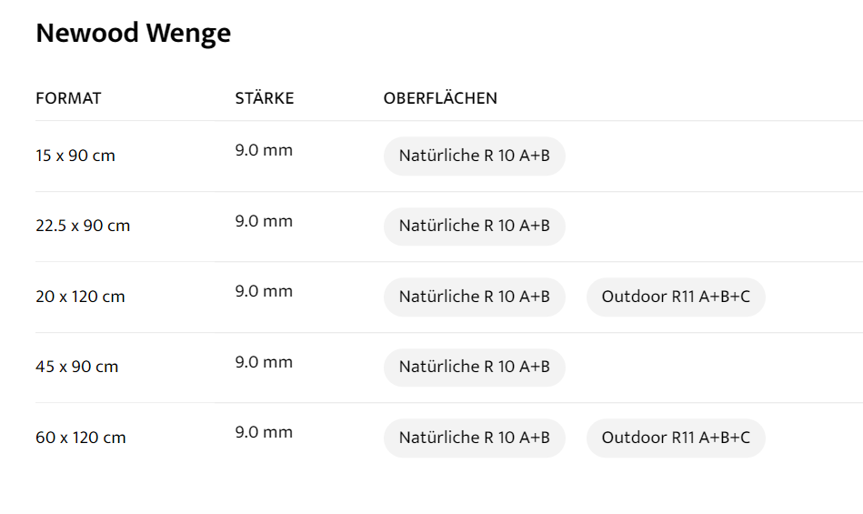 | wählen | FORMAT : 15 x 90 cm, STÄRKE : 9.0 mm, OBERFLÄCHEN : Natürliche R 10 A+B, FORMAT : 22.5 x 90 cm, STÄRKE : 9.0 mm, OBERFLÄCHEN : Natürliche R 10 A+B, FORMAT : 20 x 120 cm, STÄRKE : 9.0 mm, OBERFLÄCHEN : Natürliche R 10 A+B Outdoor R11 A+B+C, FORMAT : 45 x 90 cm, STÄRKE : 9.0 mm, OBERFLÄCHEN : Natürliche R 10 A+B, FORMAT : 60 x 120 cm, STÄRKE : 9.0 mm, OBERFLÄCHEN : Natürliche R 10 A+B Outdoor R11 A+B+C |