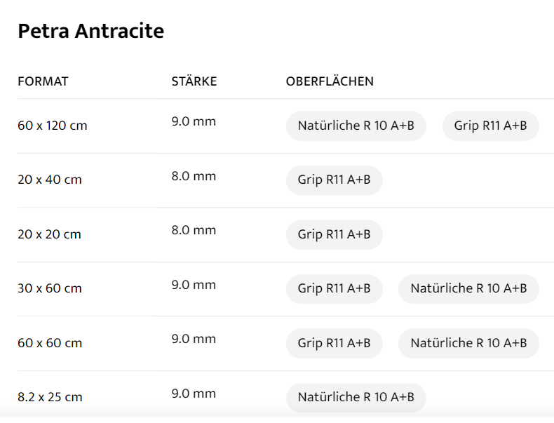 | wählen | FORMAT : 60 x 120 cm, STÄRKE : 9.0 mm, OBERFLÄCHEN : Natürliche R 10 A+B Grip R11 A+B, FORMAT : 20 x 40 cm, STÄRKE : 8.0 mm, OBERFLÄCHEN :Grip R11 A+B, FORMAT : 20 x 20 cm, STÄRKE : 8.0 mm, OBERFLÄCHEN :Grip R11 A+B, FORMAT : 30 x 60 cm, STÄRKE : 9.0 mm, OBERFLÄCHEN :Grip R11 A+B Natürliche R 10 A+B, FORMAT : 60 x 60 cm, STÄRKE : 9.0 mm, OBERFLÄCHEN :Grip R11 A+B Natürliche R 10 A+B, FORMAT : 8.2 x 25 cm, STÄRKE : 9.0 mm, OBERFLÄCHEN :Natürliche R 10 A+B |