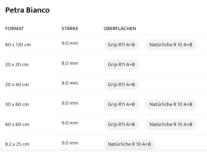 | wählen | FORMAT : 60 x 120 cm, STÄRKE : 9.0 mm, OBERFLÄCHEN : Grip R11 A+B Natürliche R 10 A+B, FORMAT : 20 x 40 cm, STÄRKE : 8.0 mm, OBERFLÄCHEN :Grip R11 A+B, FORMAT : 20 x 20 cm, STÄRKE : 8.0 mm, OBERFLÄCHEN :Grip R11 A+B, FORMAT : 30 x 60 cm, STÄRKE : 9.0 mm, OBERFLÄCHEN :Grip R11 A+B Natürliche R 10 A+B, FORMAT : 60 x 60 cm, STÄRKE : 9.0 mm, OBERFLÄCHEN :Grip R11 A+B Natürliche R 10 A+B, FORMAT : 8.2 x 25 cm, STÄRKE : 9.0 mm, OBERFLÄCHEN :Natürliche R 10 A+B |