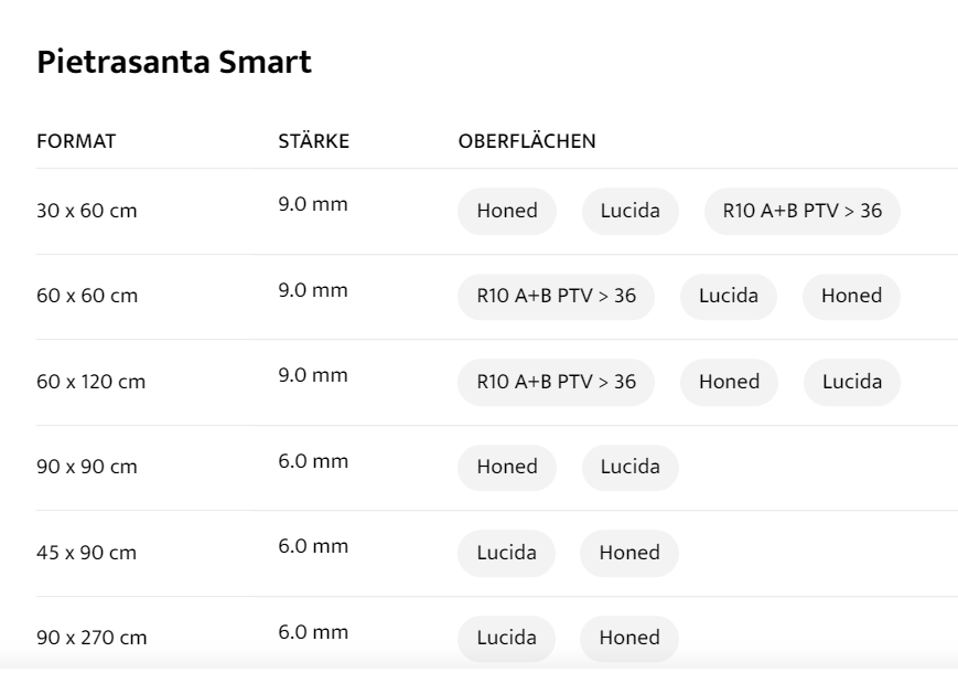 | wählen | FORMAT : 30 x 60 cm STÄRKE :9.0 mm OBERFLÄCHEN : Honed Lucida R10 A+B PTV > 36, FORMAT : 60 x 60 cm STÄRKE : 9.0 mm OBERFLÄCHEN : R10 A+B PTV > 36 Lucida Honed, FORMAT : 60 x 120 cm STÄRKE : 9.0 mm OBERFLÄCHEN : R10 A+B PTV > 36 Honed Lucida, FORMAT : 45 x 90 cm STÄRKE : 6.0 mm OBERFLÄCHEN : Lucida Honed, FORMAT : 90 x 90 cm STÄRKE : 6.0 mm OBERFLÄCHEN : Honed Lucida, FORMAT : 90 x 270 cm STÄRKE : 6.0 mm OBERFLÄCHEN : Lucida Honed |