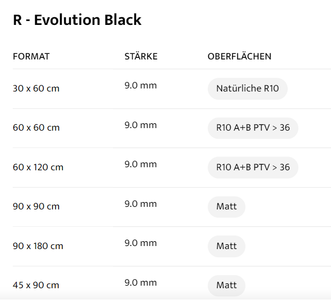 FORMAT : 30 x 60 cm, STÄRKE : 9.0 mm, OBERFLÄCHEN : Natürliche R10, FORMAT : 60 x 60 cm, STÄRKE : 9.0 mm, OBERFLÄCHEN : R10 A+B PTV > 36, FORMAT : 60 x 120 cm, STÄRKE : 9.0 mm, OBERFLÄCHEN : R10 A+B PTV > 36, FORMAT : 90 x 90 cm, STÄRKE : 9.0 mm, OBERFLÄCHEN : Matt, FORMAT : 90 x 180 cm, STÄRKE : 9.0 mm, OBERFLÄCHEN : Matt, FORMAT : 45 x 90 cm, STÄRKE : 9.0 mm, OBERFLÄCHEN : Matt