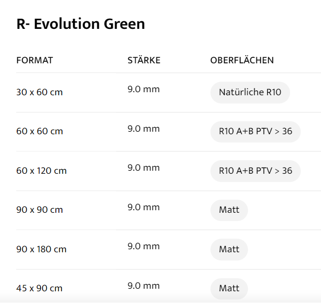 FORMAT : 30 x 60 cm, STÄRKE : 9.0 mm, OBERFLÄCHEN : Natürliche R10, FORMAT : 60 x 60 cm, STÄRKE : 9.0 mm, OBERFLÄCHEN : R10 A+B PTV > 36, FORMAT : 60 x 120 cm, STÄRKE : 9.0 mm, OBERFLÄCHEN : R10 A+B PTV > 36, FORMAT : 90 x 90 cm, STÄRKE : 9.0 mm, OBERFLÄCHEN : Matt, FORMAT : 90 x 180 cm, STÄRKE : 9.0 mm, OBERFLÄCHEN : Matt, FORMAT : 45 x 90 cm, STÄRKE : 9.0 mm, OBERFLÄCHEN : Matt