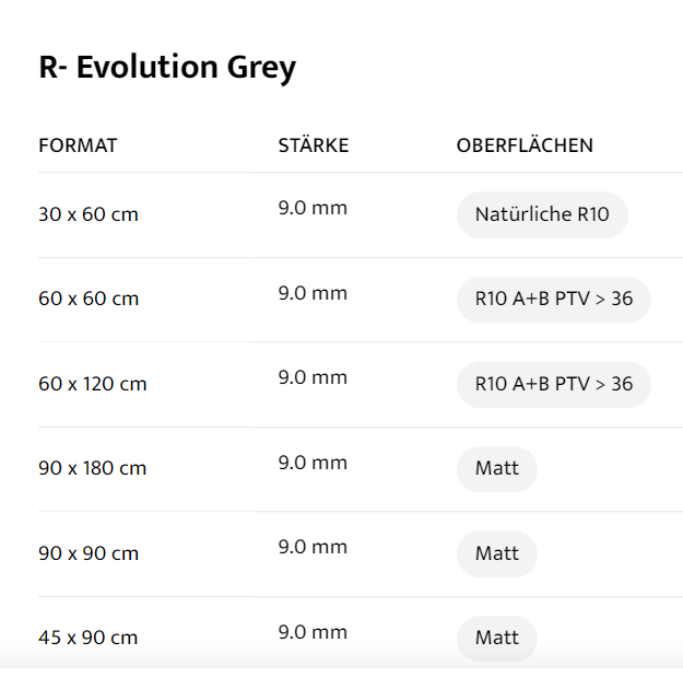 FORMAT : 30 x 60 cm, STÄRKE : 9.0 mm, OBERFLÄCHEN : Natürliche R10, FORMAT : 60 x 60 cm, STÄRKE : 9.0 mm, OBERFLÄCHEN : R10 A+B PTV > 36, FORMAT : 60 x 120 cm, STÄRKE : 9.0 mm, OBERFLÄCHEN : R10 A+B PTV > 36, FORMAT : 90 x 90 cm, STÄRKE : 9.0 mm, OBERFLÄCHEN : Matt, FORMAT : 90 x 180 cm, STÄRKE : 9.0 mm, OBERFLÄCHEN : Matt, FORMAT : 45 x 90 cm, STÄRKE : 9.0 mm, OBERFLÄCHEN : Matt
