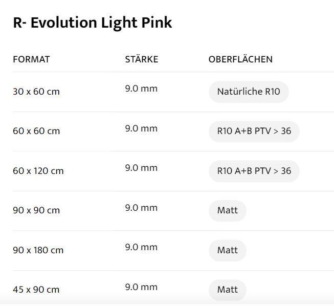 | wählen | FORMAT : 30 x 60 cm, STÄRKE : 9.0 mm, OBERFLÄCHEN : Natürliche R10, FORMAT : 60 x 60 cm, STÄRKE : 9.0 mm, OBERFLÄCHEN : R10 A+B PTV > 36, FORMAT : 60 x 120 cm, STÄRKE : 9.0 mm, OBERFLÄCHEN : R10 A+B PTV > 36, FORMAT : 90 x 90 cm, STÄRKE : 9.0 mm, OBERFLÄCHEN : Matt, FORMAT : 90 x 180 cm, STÄRKE : 9.0 mm, OBERFLÄCHEN : Matt, FORMAT : 45 x 90 cm, STÄRKE : 9.0 mm, OBERFLÄCHEN : Matt |