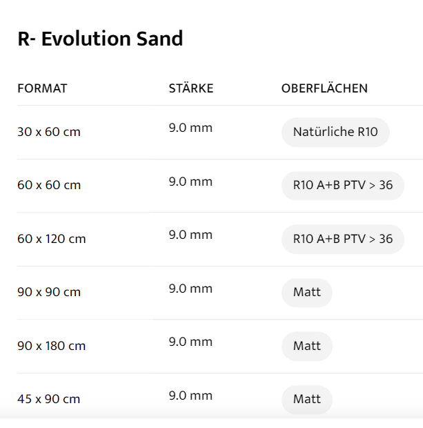 FORMAT : 30 x 60 cm, STÄRKE : 9.0 mm, OBERFLÄCHEN : Natürliche R10, FORMAT : 60 x 60 cm, STÄRKE : 9.0 mm, OBERFLÄCHEN : R10 A+B PTV > 36, FORMAT : 60 x 120 cm, STÄRKE : 9.0 mm, OBERFLÄCHEN : R10 A+B PTV > 36, FORMAT : 90 x 90 cm, STÄRKE : 9.0 mm, OBERFLÄCHEN : Matt, FORMAT : 90 x 180 cm, STÄRKE : 9.0 mm, OBERFLÄCHEN : Matt, FORMAT : 45 x 90 cm, STÄRKE : 9.0 mm, OBERFLÄCHEN : Matt