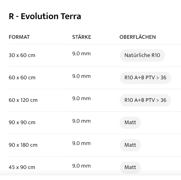 FORMAT : 30 x 60 cm, STÄRKE : 9.0 mm, OBERFLÄCHEN : Natürliche R10, FORMAT : 60 x 60 cm, STÄRKE : 9.0 mm, OBERFLÄCHEN : R10 A+B PTV > 36, FORMAT : 60 x 120 cm, STÄRKE : 9.0 mm, OBERFLÄCHEN : R10 A+B PTV > 36, FORMAT : 90 x 90 cm, STÄRKE : 9.0 mm, OBERFLÄCHEN : Matt, FORMAT : 90 x 180 cm, STÄRKE : 9.0 mm, OBERFLÄCHEN : Matt, FORMAT : 45 x 90 cm, STÄRKE : 9.0 mm, OBERFLÄCHEN : Matt
