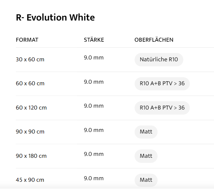 FORMAT : 30 x 60 cm, STÄRKE : 9.0 mm, OBERFLÄCHEN : Natürliche R10, FORMAT : 60 x 60 cm, STÄRKE : 9.0 mm, OBERFLÄCHEN : R10 A+B PTV > 36, FORMAT : 60 x 120 cm, STÄRKE : 9.0 mm, OBERFLÄCHEN : R10 A+B PTV > 36, FORMAT : 90 x 90 cm, STÄRKE : 9.0 mm, OBERFLÄCHEN : Matt, FORMAT : 90 x 180 cm, STÄRKE : 9.0 mm, OBERFLÄCHEN : Matt, FORMAT : 45 x 90 cm, STÄRKE : 9.0 mm, OBERFLÄCHEN : Matt