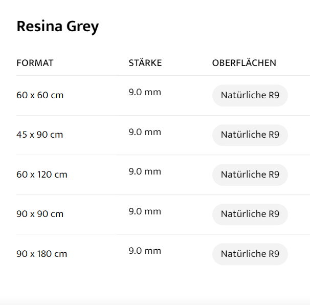 | wählen | FORMAT : 60 x 60 cm, STÄRKE : 9.0 mm, OBERFLÄCHEN : Natürliche R9, FORMAT : 45 x 90 cm, STÄRKE : 9.0 mm, OBERFLÄCHEN : Natürliche R9, FORMAT : 60 x 120 cm, STÄRKE : 9.0 mm, OBERFLÄCHEN : Natürliche R9, FORMAT : 90 x 90 cm, STÄRKE : 9.0 mm, OBERFLÄCHEN : Natürliche R9, FORMAT : 90 x 180 cm, STÄRKE : 9.0 mm, OBERFLÄCHEN : Natürliche R9 |