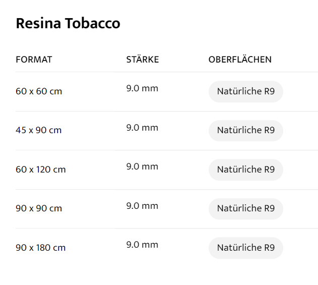 FORMAT : 60 x 60 cm, STÄRKE : 9.0 mm, OBERFLÄCHEN : Natürliche R9, FORMAT : 45 x 90 cm, STÄRKE : 9.0 mm, OBERFLÄCHEN : Natürliche R9, FORMAT : 60 x 120 cm, STÄRKE : 9.0 mm, OBERFLÄCHEN : Natürliche R9, FORMAT : 90 x 90 cm, STÄRKE : 9.0 mm, OBERFLÄCHEN : Natürliche R9, FORMAT : 90 x 180 cm, STÄRKE : 9.0 mm, OBERFLÄCHEN : Natürliche R9