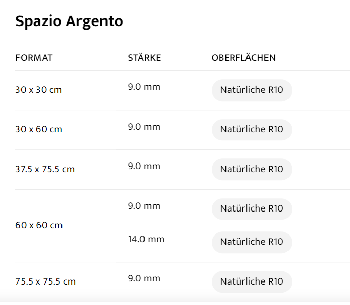 FORMAT : 30 x 30 cm, STÄRKE :9.0 mm, OBERFLÄCHEN : Natürliche R10, FORMAT : 30 x 60 cm, STÄRKE :9.0 mm, OBERFLÄCHEN : Natürliche R10, FORMAT : 37.5 x 75.5 cm, STÄRKE :9.0 mm, OBERFLÄCHEN : Natürliche R10, FORMAT : 60 x 60 cm, STÄRKE :9.0 mm, OBERFLÄCHEN : Natürliche R10, FORMAT : 60 x 60 cm, STÄRKE :14.0 mm, OBERFLÄCHEN : Natürliche R10, FORMAT : 75.5 x 75.5 cm, STÄRKE :9.0 mm, OBERFLÄCHEN : Natürliche R10