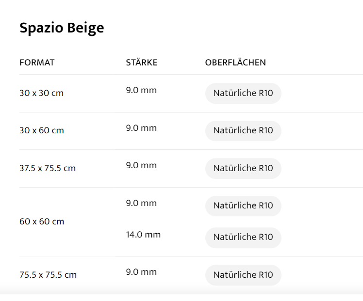 FORMAT : 30 x 30 cm, STÄRKE :9.0 mm, OBERFLÄCHEN : Natürliche R10, FORMAT : 30 x 60 cm, STÄRKE :9.0 mm, OBERFLÄCHEN : Natürliche R10, FORMAT : 37.5 x 75.5 cm, STÄRKE :9.0 mm, OBERFLÄCHEN : Natürliche R10, FORMAT : 60 x 60 cm, STÄRKE :9.0 mm, OBERFLÄCHEN : Natürliche R10, FORMAT : 60 x 60 cm, STÄRKE :14.0 mm, OBERFLÄCHEN : Natürliche R10, FORMAT : 75.5 x 75.5 cm, STÄRKE :9.0 mm, OBERFLÄCHEN : Natürliche R10