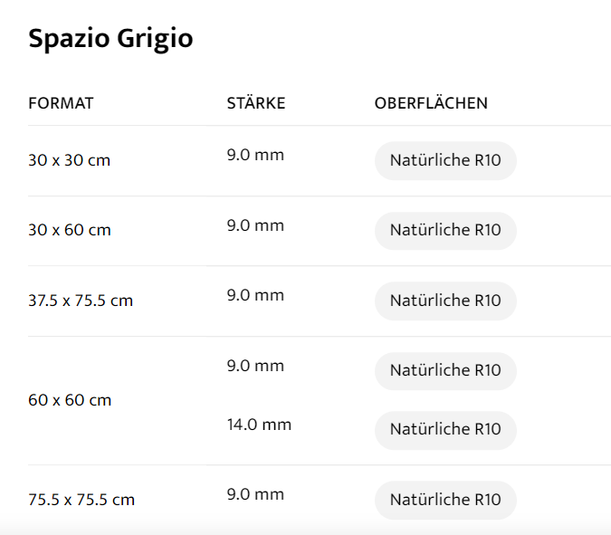 | wählen | FORMAT : 30 x 30 cm, STÄRKE :9.0 mm, OBERFLÄCHEN : Natürliche R10, FORMAT : 30 x 60 cm, STÄRKE :9.0 mm, OBERFLÄCHEN : Natürliche R10, FORMAT : 37.5 x 75.5 cm, STÄRKE :9.0 mm, OBERFLÄCHEN : Natürliche R10, FORMAT : 60 x 60 cm, STÄRKE :9.0 mm, OBERFLÄCHEN : Natürliche R10, FORMAT : 60 x 60 cm, STÄRKE :14.0 mm, OBERFLÄCHEN : Natürliche R10, FORMAT : 75.5 x 75.5 cm, STÄRKE :9.0 mm, OBERFLÄCHEN : Natürliche R10 |