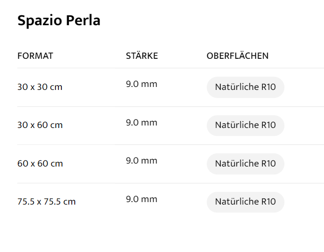 | wählen | FORMAT : 30 x 30 cm, STÄRKE :9.0 mm, OBERFLÄCHEN : Natürliche R10, FORMAT : 30 x 60 cm, STÄRKE :9.0 mm, OBERFLÄCHEN : Natürliche R10, FORMAT : 37.5 x 75.5 cm, STÄRKE :9.0 mm, OBERFLÄCHEN : Natürliche R10, FORMAT : 60 x 60 cm, STÄRKE :9.0 mm, OBERFLÄCHEN : Natürliche R10, FORMAT : 60 x 60 cm, STÄRKE :14.0 mm, OBERFLÄCHEN : Natürliche R10, FORMAT : 75.5 x 75.5 cm, STÄRKE :9.0 mm, OBERFLÄCHEN : Natürliche R10 |