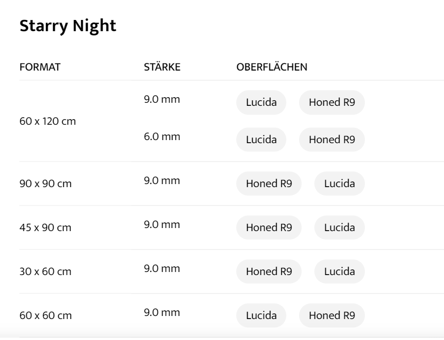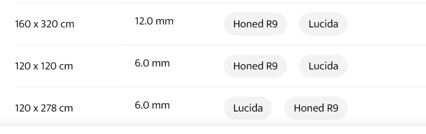 | wählen | FORMAT : 60 x 120 cm, STÄRKE : 9.0 mm, OBERFLÄCHEN : Lucida Honed R9, FORMAT : 60 x 120 cm, STÄRKE : 6.0 mm, OBERFLÄCHEN : Lucida Honed R9, FORMAT : 90 x 90 cm, STÄRKE : 9.0 mm, OBERFLÄCHEN : Honed R9 Lucida, FORMAT : 45 x 90 cm, STÄRKE : 9.0 mm, OBERFLÄCHEN : Honed R9 Lucida, FORMAT : 30 x 60 cm, STÄRKE : 9.0 mm, OBERFLÄCHEN : Honed R9 Lucida, FORMAT : 60 x 60 cm, STÄRKE : 9.0 mm, OBERFLÄCHEN : Lucida Honed R9, FORMAT : 160 x 320 cm, STÄRKE : 12.0 mm, OBERFLÄCHEN : Honed R9 Lucida, FORMAT : 120 x 120 cm, STÄRKE : 6.0mm, OBERFLÄCHEN : Honed R9 Lucida, FORMAT : 120 x 278 cm, STÄRKE : 6 mm, OBERFLÄCHEN : Lucida Honed R9 |