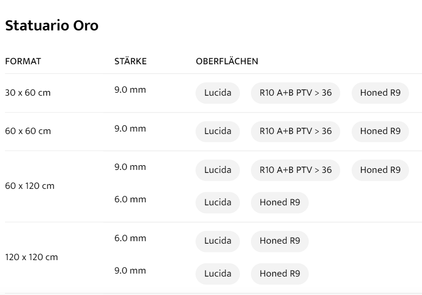 | wählen | FORMAT : 30 x 60 cm, STÄRKE : 9.0 mm, OBERFLÄCHEN : Lucida R10 A+B PTV > 36 Honed R9, FORMAT : 60 x 60 cm, STÄRKE : 9.0 mm, OBERFLÄCHEN : Lucida R10 A+B PTV > 36 Honed R9, FORMAT : 60 x 120 cm, STÄRKE : 9.0 mm, OBERFLÄCHEN : Lucida R10 A+B PTV > 36 Honed R9, FORMAT : 60 x 120 cm, STÄRKE : 6.0 mm, OBERFLÄCHEN : Lucida Honed R9, FORMAT : 90 x 90 cm, STÄRKE : 9.0 mm, OBERFLÄCHEN : Lucida Honed R9, FORMAT : 120 x 120 cm, STÄRKE : 6.0 mm, OBERFLÄCHEN : Lucida Honed R9, FORMAT : 120 x 120 cm, STÄRKE : 9.0 mm, OBERFLÄCHEN : Lucida Honed R9, FORMAT : 90 x 180 cm, STÄRKE : 9.0 mm, OBERFLÄCHEN : Lucida Honed R9, FORMAT : 120 x 240 cm, STÄRKE : 6.0 mm, OBERFLÄCHEN : Lucida Honed R9, FORMAT : 160x 320 cm, STÄRKE : 12.0 mm, OBERFLÄCHEN : Lucida Honed R9, FORMAT :160 x 320 cm, STÄRKE : 6.0 mm, OBERFLÄCHEN : Lucida Honed R9, FORMAT : 120 x 278 cm, STÄRKE : 6.0 mm, OBERFLÄCHEN : Honed R9 Lucida, FORMAT : 45 x 90 cm, STÄRKE : 9.0 mm, OBERFLÄCHEN : Lucida Honed R9 |