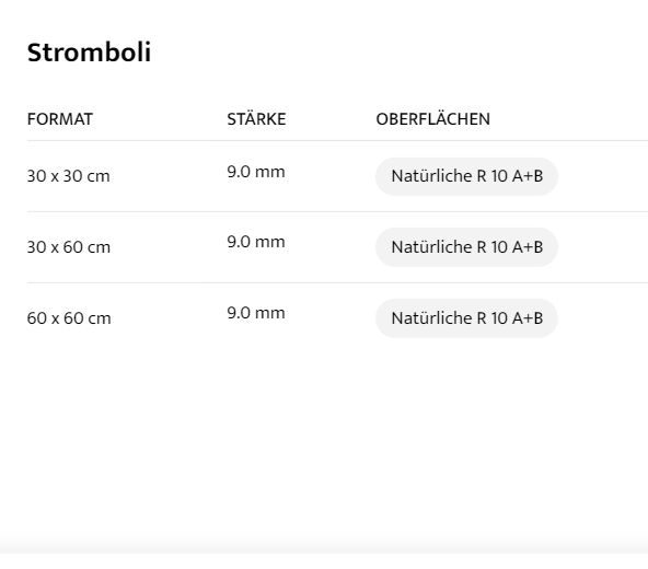 FORMAT : 30 x 30 cm, STÄRKE : 9.0 mm, OBERFLÄCHEN : Natürliche R 10 A+B, FORMAT : 30 x 60 cm, STÄRKE : 9.0 mm, OBERFLÄCHEN : Natürliche R 10 A+B, FORMAT : 60 x 60 cm, STÄRKE : 9.0 mm, OBERFLÄCHEN : Natürliche R 10 A+B