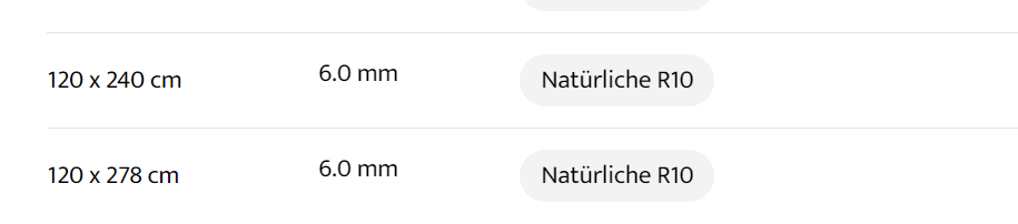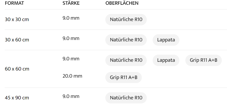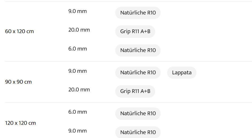 | wählen | 30 x 30 cm 9.0 mm Natürliche R10, 30 x 60 cm 9.0 mm Natürliche R10 Lappata, 60 x 60 cm 9.0 mm Natürliche R10 Lappata Grip R11 A+B, 60 x 60 cm 20.0 mm Grip R11 A+B, 45 x 90 cm 9.0 mm Natürliche R10, 60 x 120 cm 9.0 mm Natürliche R10, 60 x 120 cm 20.0 mm Grip R11 A+B, 60 x 120 cm 6.0 mm Natürliche R10, 90 x 90 cm 9.0 mm Natürliche R10 Lappata, 90 x 90 cm 20.0 mm Grip R11 A+B, 120 x 120 cm 6.0 mm Natürliche R10, 120 x 120 cm 9.0 mm Natürliche R10, 120 x 240 cm 6.0 mm Natürliche R10, 120 x 278 cm 6.0 mm Natürliche R10 |