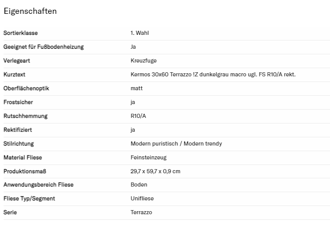 StartseiteFliesenTERRAZZOTERRAZZO dunkelgrau matt. Quantity of products in cart must be 10 or moreTERRAZZO dunkelgrau matt.CHF33,60 – CHF37,65 / m2wählen Wählen Sie eine Option30 x 60 x 0,9 cm60 x 60 x 0,9 cmLeerenWählen Sie die Menge als Quadratmeter aus: TERRAZZO dunkelgrau matt. Menge Buy now Artikelnummer: n. a. Kategorien: Fliesen, TERRAZZO Product ID: 25624 Beschreibung Zusätzliche Information Bewertungen (0) BeschreibungZusätzliche Informationwählen30 x 60 x 0,9 cm, 60 x 60 x 0,9 cm BewertungenEs gibt noch keine Bewertungen. Schreiben Sie die erste Bewertung für «TERRAZZO dunkelgrau matt.» Antworten abbrechenIhre E-Mail-Adresse wird nicht veröffentlicht. Erforderliche Felder sind mit * markiertName *E-Mail * Meinen Namen, meine E-Mail-Adresse und meine Website in diesem Browser für die nächste Kommentierung speichern.Ihre Bewertung *Bewertung…AusgezeichnetGutDurchschnittlichNicht ganz schlechtSehr schlecht Ihre Rezension * I agree that my submitted data is being collected and stored.Please enter an answer in digits:19 + sixteen = Ähnliche Produkte OPERA blue marmoriert. CHF37,80 – CHF42,00 / m2 Buy now Dieses Produkt weist mehrere Varianten auf. Die Optionen können auf der Produktseite gewählt werden OPERA ivory marmoriert. CHF37,80 – CHF42,00 / m2 Buy now Dieses Produkt weist mehrere Varianten auf. Die Optionen können auf der Produktseite gewählt werden TAILORED ivory matt. CHF33,00 – CHF37,00 / m2 Buy now Dieses Produkt weist mehrere Varianten auf. Die Optionen können auf der Produktseite gewählt werden LIMESTONE cream matt. CHF30,25 – CHF50,40 / m2 Buy now Dieses Produkt weist mehrere Varianten auf. Die Optionen können auf der Produktseite gewählt werden