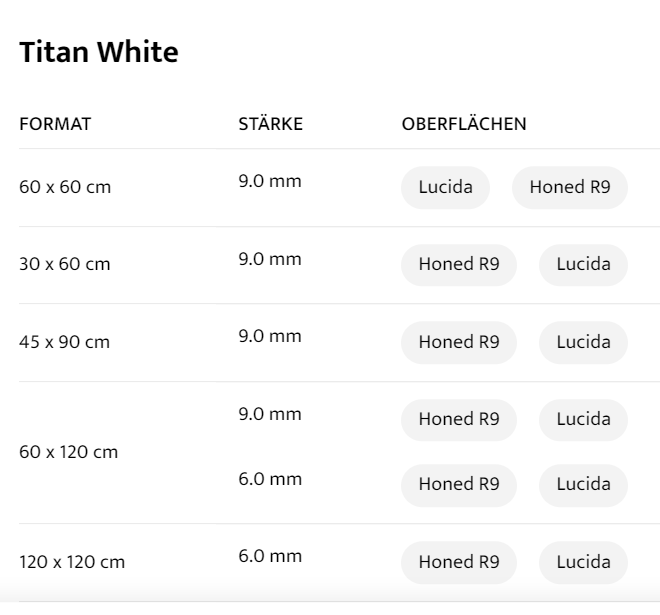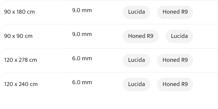 | wählen | FORMAT : 60 x 60 cm, STÄRKE : 9.0 mm, OBERFLÄCHEN : Lucida Honed R9, FORMAT : 30 x 60 cm, STÄRKE : 9.0 mm, OBERFLÄCHEN : Honed R9 Lucida, FORMAT : 45 x 90 cm, STÄRKE : 9.0 mm, OBERFLÄCHEN : Honed R9 Lucida, FORMAT : 60 x 120 cm, STÄRKE : 9.0 mm, OBERFLÄCHEN : Honed R9 Lucida, FORMAT : 60 x 120 cm, STÄRKE : 6.0 mm, OBERFLÄCHEN : Honed R9 Lucida, FORMAT : 120 x 120 cm, STÄRKE : 6.0 mm, OBERFLÄCHEN : Honed R9 Lucida, FORMAT : 90 x 180 cm, STÄRKE : 9.0 mm, OBERFLÄCHEN : Lucida Honed R9, FORMAT : 90 x 90 cm, STÄRKE : 9.0 mm, OBERFLÄCHEN : Honed R9 Lucida, FORMAT : 120 x 278 cm, STÄRKE : 6.0 mm, OBERFLÄCHEN :Lucida Honed R9, FORMAT : 120 x 240 cm, STÄRKE : 6.0 mm, OBERFLÄCHEN : Lucida Honed R9 |