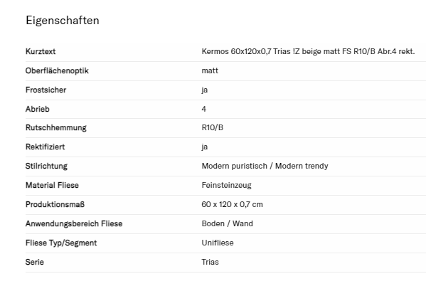 StartseiteFliesenTRIASTRIAS beige matt. Quantity of products in cart must be 10 or moreTRIAS beige matt.CHF46,20 / m2wählen Wählen Sie eine Option60 x 120 x 0,7 cmLeerenWählen Sie die Menge als Quadratmeter aus: TRIAS beige matt. Menge Buy now Artikelnummer: n. a. Kategorien: Fliesen, TRIAS Product ID: 25248 Beschreibung Zusätzliche Information Bewertungen (0) BeschreibungZusätzliche Informationwählen60 x 120 x 0,7 cm BewertungenEs gibt noch keine Bewertungen. Schreiben Sie die erste Bewertung für «TRIAS beige matt.» Antworten abbrechenIhre E-Mail-Adresse wird nicht veröffentlicht. Erforderliche Felder sind mit * markiertName *E-Mail * Meinen Namen, meine E-Mail-Adresse und meine Website in diesem Browser für die nächste Kommentierung speichern.Ihre Bewertung *Bewertung…AusgezeichnetGutDurchschnittlichNicht ganz schlechtSehr schlecht Ihre Rezension * I agree that my submitted data is being collected and stored.Please enter an answer in digits:12 + 5 = Ähnliche Produkte Mila anthrazit matt. CHF29,40 – CHF45,60 / m2 Buy now Dieses Produkt weist mehrere Varianten auf. Die Optionen können auf der Produktseite gewählt werden OPERA white marmoriert. CHF37,80 – CHF42,00 / m2 Buy now Dieses Produkt weist mehrere Varianten auf. Die Optionen können auf der Produktseite gewählt werden NATURAL WOODS grau matt. CHF51,70 – CHF70,00 / m2 Buy now Dieses Produkt weist mehrere Varianten auf. Die Optionen können auf der Produktseite gewählt werden NEWCON creme CHF10,05 – CHF14,50 / m2 Buy now Dieses Produkt weist mehrere Varianten auf. Die Optionen können auf der Produktseite gewählt werden