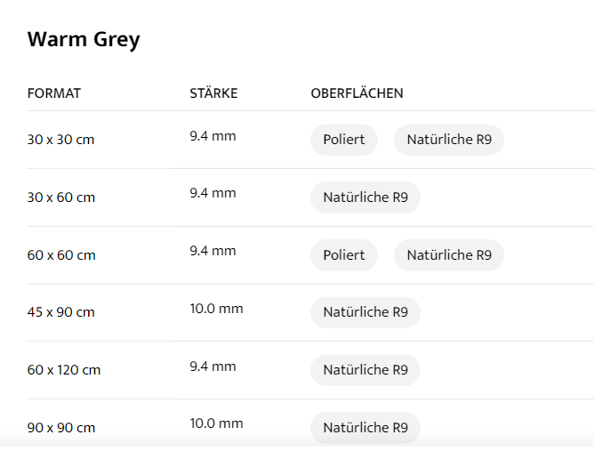 FORMAT : 30 x 30 cm, STÄRKE : 9.4 mm, OBERFLÄCHEN : Poliert Natürliche R9, FORMAT : 30 x 60 cm, STÄRKE : 9.4 mm, OBERFLÄCHEN : Natürliche R9, FORMAT : 60 x 60 cm, STÄRKE : 9.4 mm, OBERFLÄCHEN : Poliert Natürliche R9, FORMAT : 45 x 90 cm, STÄRKE : 10.0 mm, OBERFLÄCHEN : Natürliche R9, FORMAT : 60 x 120 cm, STÄRKE : 9.4 mm, OBERFLÄCHEN : Natürliche R9, FORMAT : 90 x 90 cm, STÄRKE : 10.0 mm, OBERFLÄCHEN : Natürliche R9